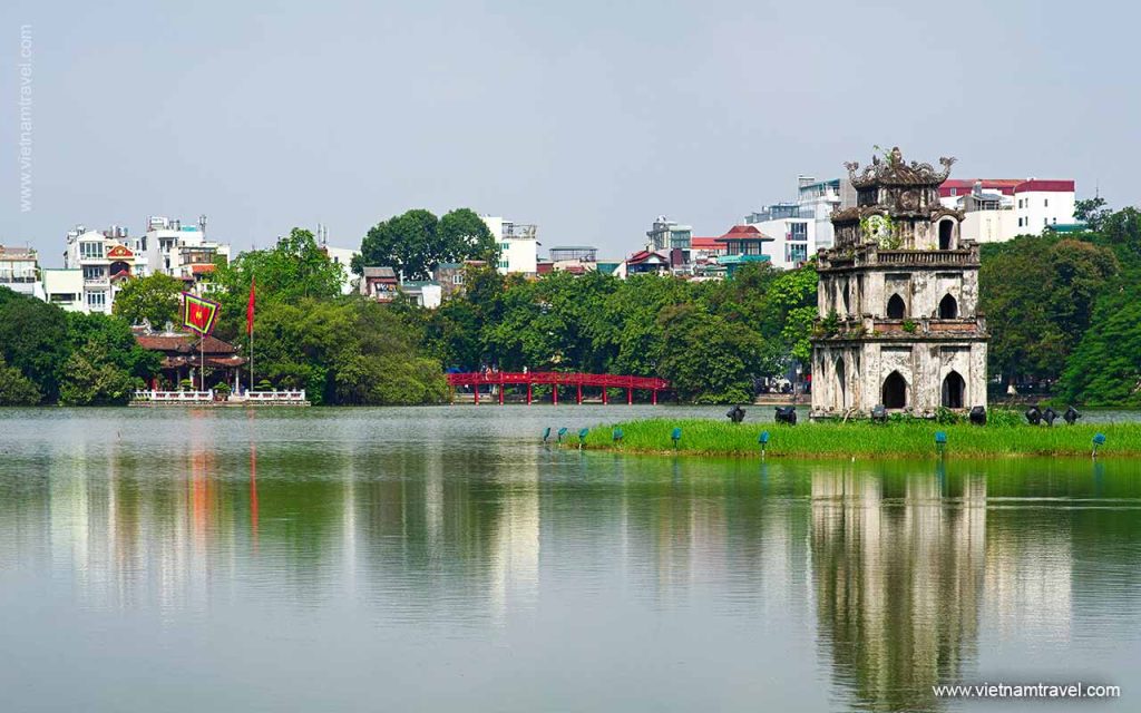 Hoan Kiem Lake’s name points to the legend that is said to lie beneath its depths: Hồ Hoàn Kiếm means “Lake of the Returned Sword”, alluding to the legend that the future Vietnamese emperor Le Loi received a sword from a magic turtle at the lake’s edge. The tale goes that Le Loi King came across a shining metal bar when he visited his friend. It turned out that his friend caught the bar in one of his attempts for fish. The King asked for the bar, brought it home and molded it into a sword. All of a sudden, there were two words printed on the sword “Thuan Thien” (harmonious with heaven). Le Loi then understood that the sword was a gift from heaven. He used it for the battle against the war with a neighboring country. At the beginning of 1428, when peace prevailed, on one of his trip to the Thuy Quan (now Hoan Kiem) Lake, there was a tortoise rising above water and shouting: “Please return the sword to the Dragon King”. Without hesitation, the King threw the sword to the lake. The tortoise took the sword and dove down the water. From then on, Thuy Quan became Hoan Kiem Lake.